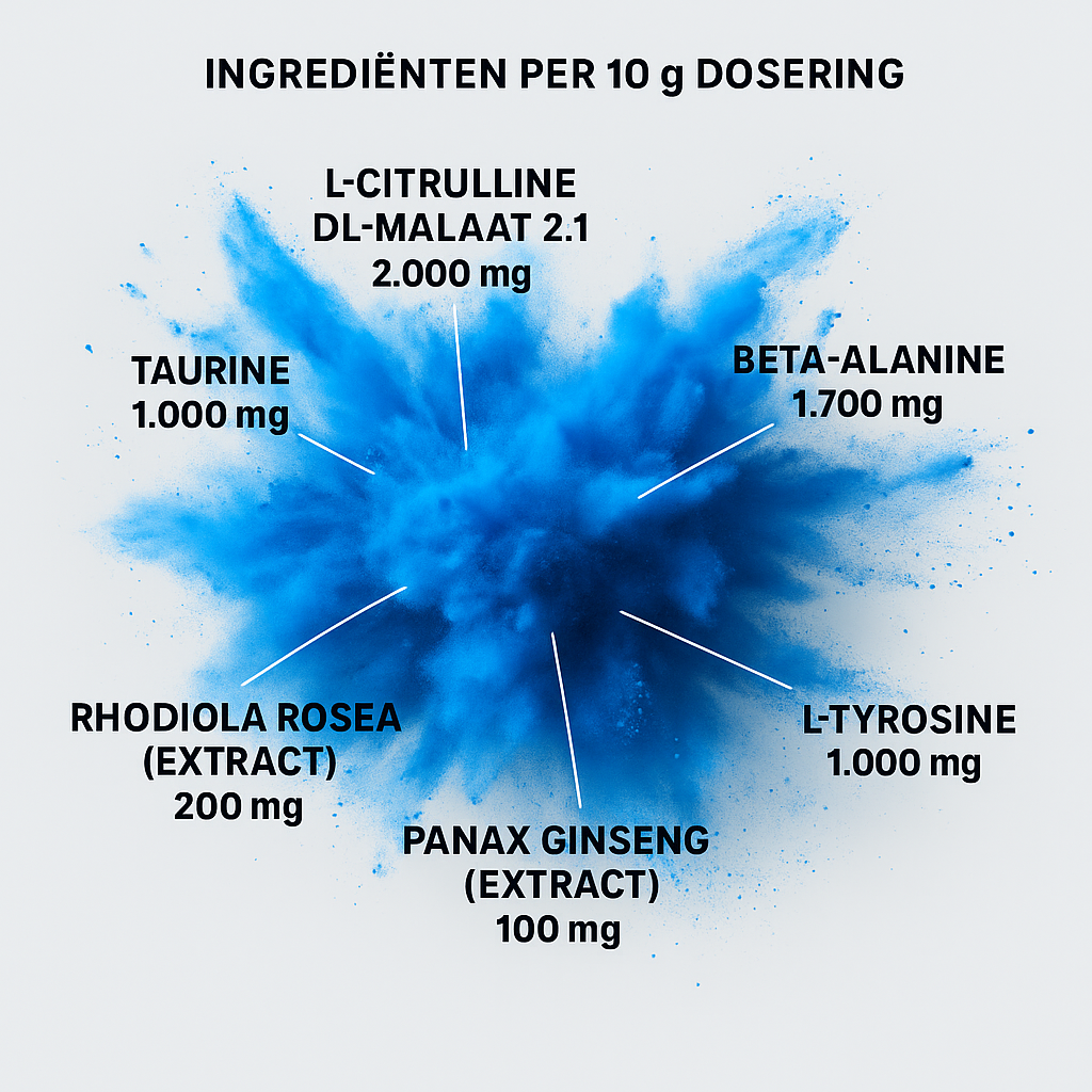 - Ondersteunt uithoudingsvermogen en mentale scherpte. Met L-citrulline, beta-alanine & adaptogenen